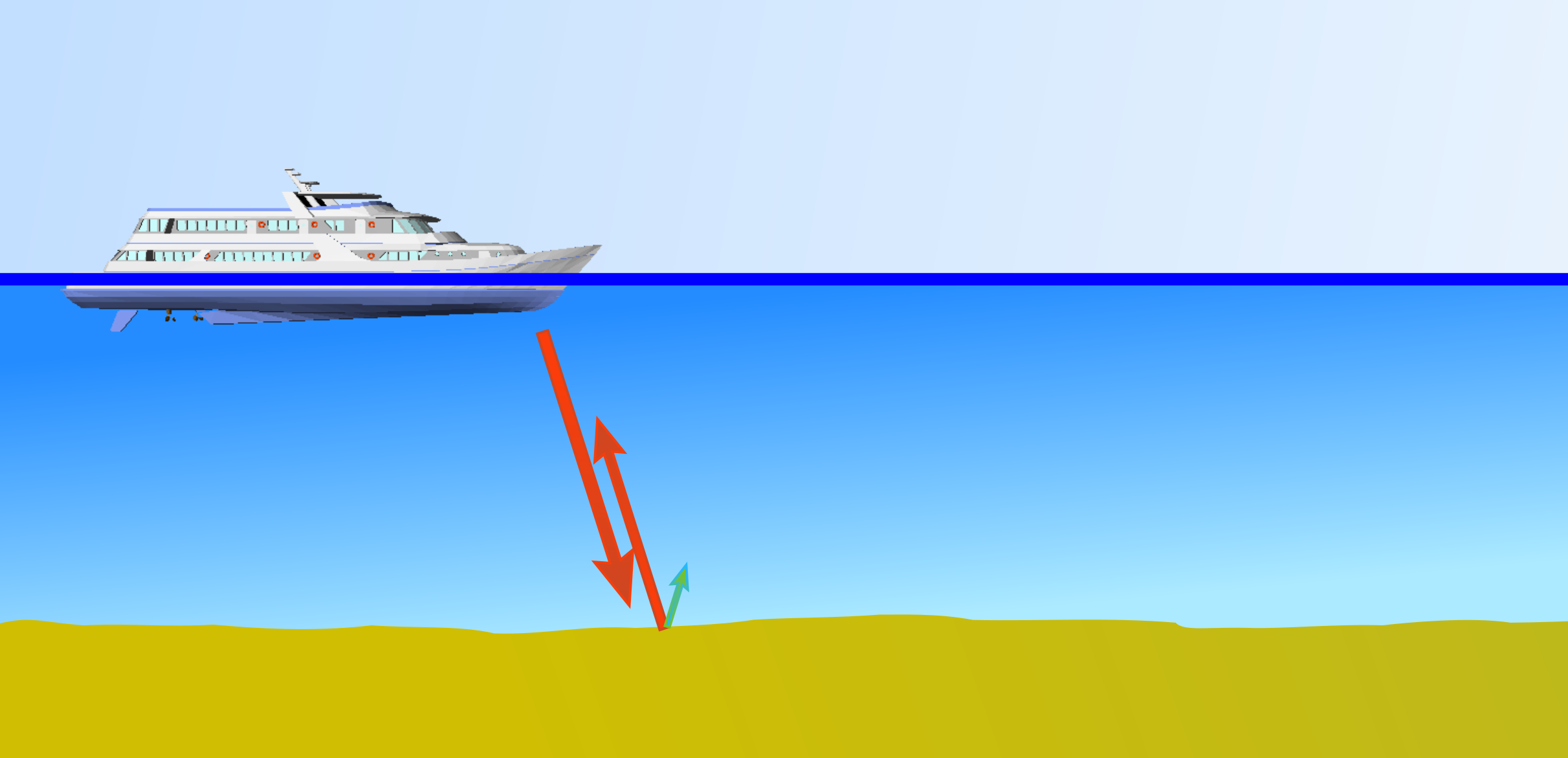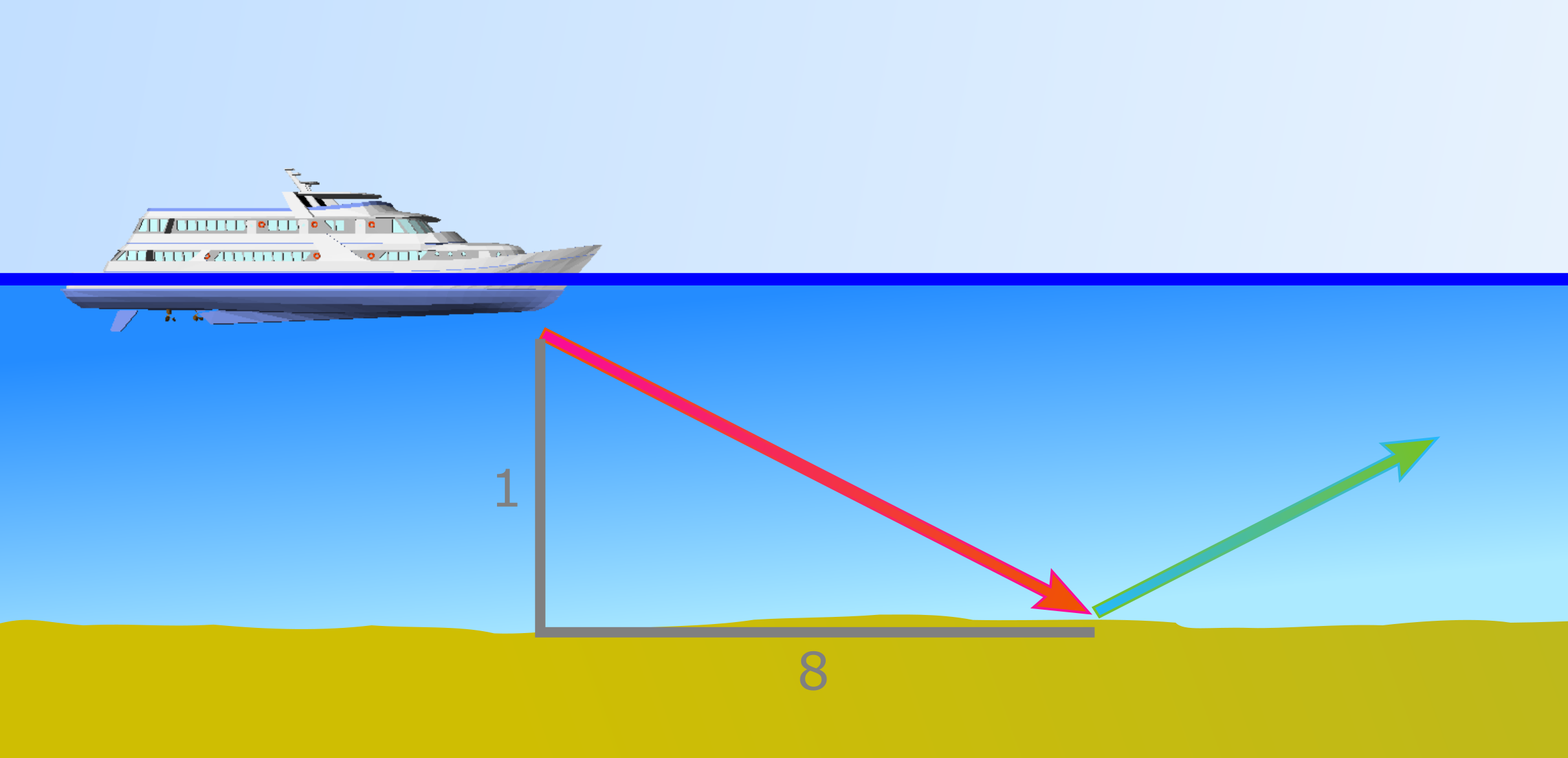 Beyond this angle, it is difficult for the detection algorithms in SonaSoft™ to make clear detections on the seafloor. The range where this angle starts to become too shallow turns out to be about 8x the depth of the water.