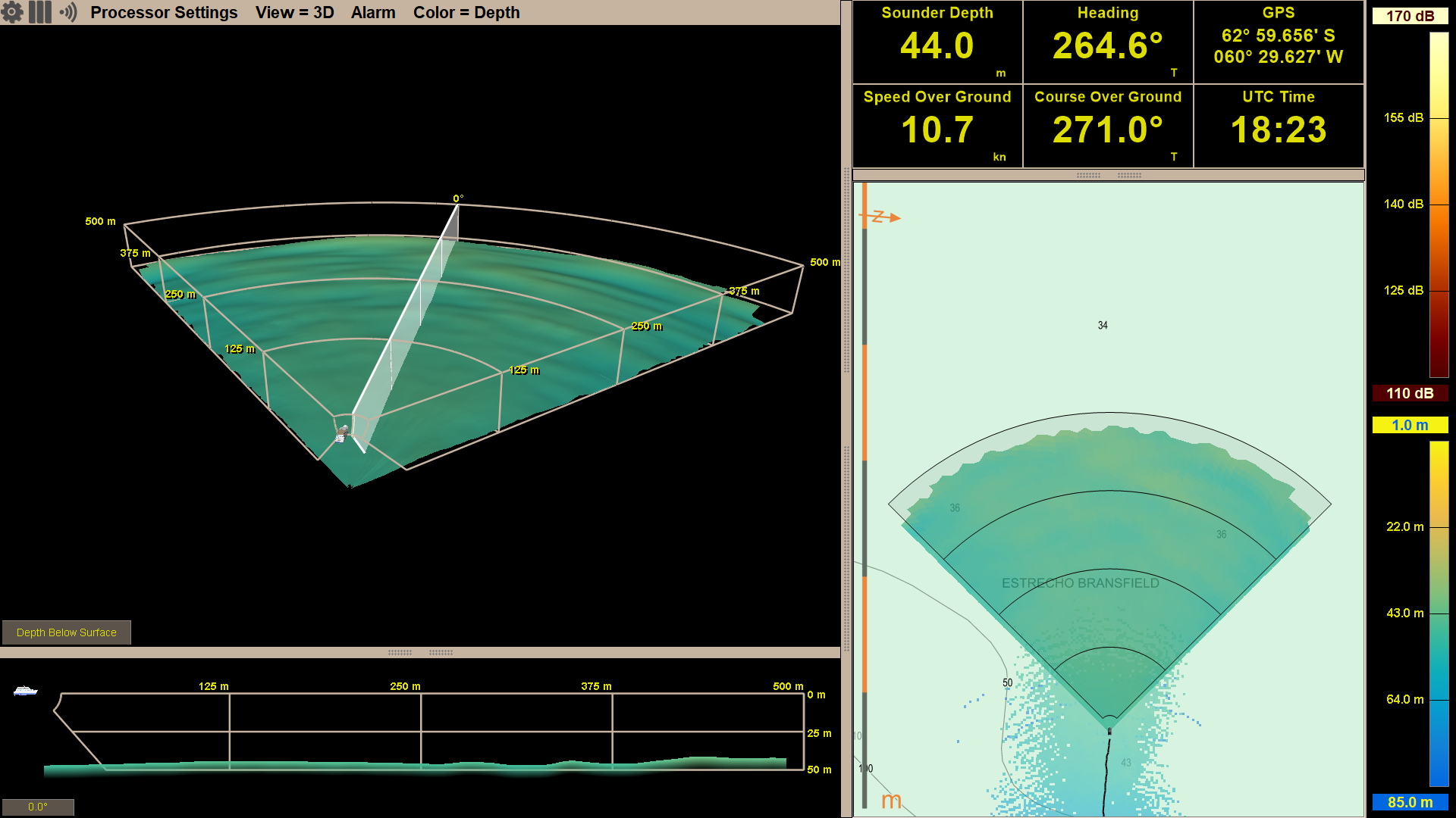 Argos sonars are designed for obstacle avoidance and as such, their energy is focused on the upper regions of the water column. FarSounder has designed these systems so that the signal is strong enough that in normal conditions a bottom mapping range of 8x the depth is obtained when the depth is less than 50 meters.