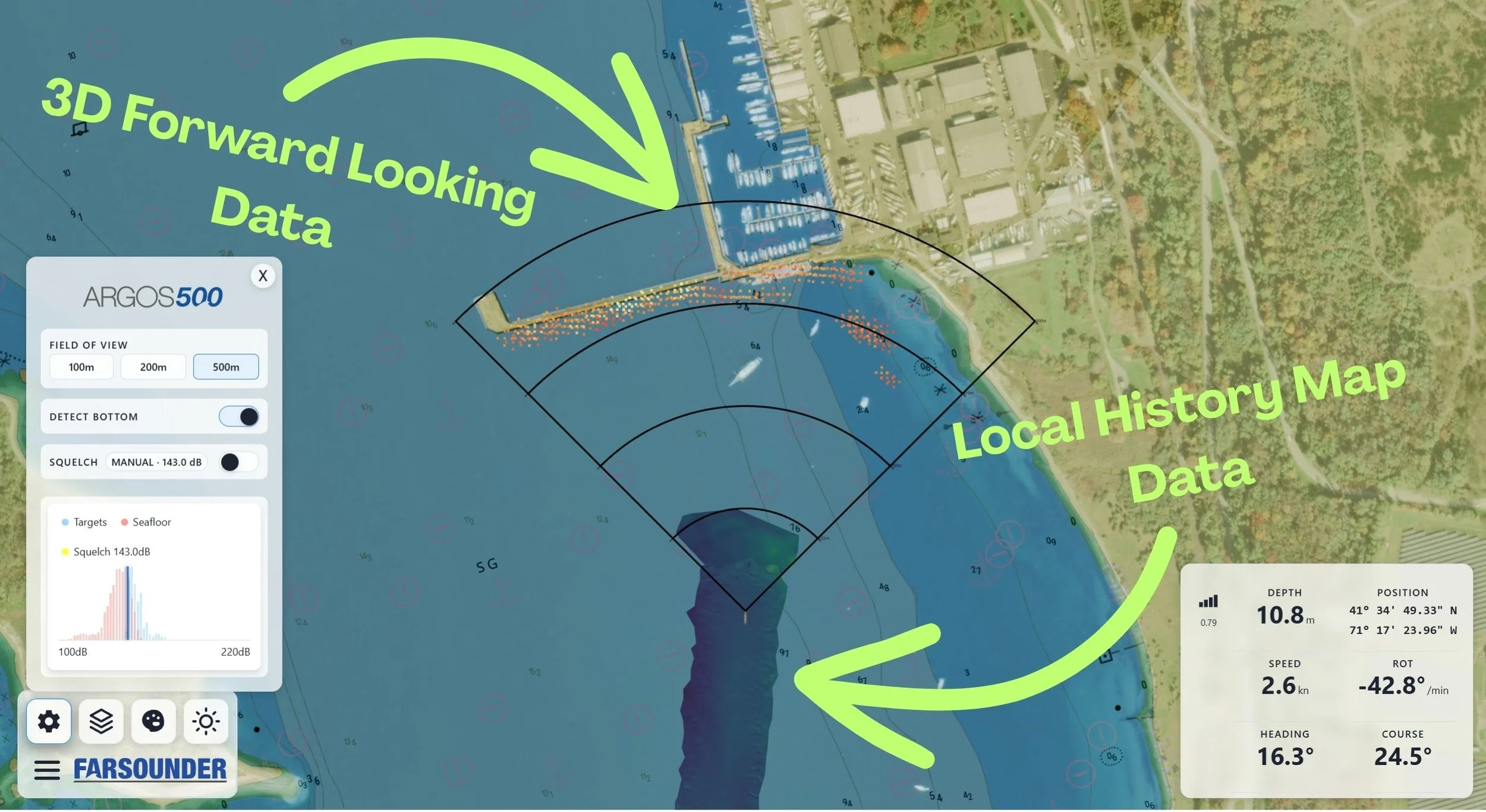 Our Argos sonars produce two types of data: 3D Forward Looking Sonar data (that’s the realtime image ahead of the vessel, inside the sonar’s field-of-view) and Local History Map™ data (the depth map of everywhere the vessel goes).